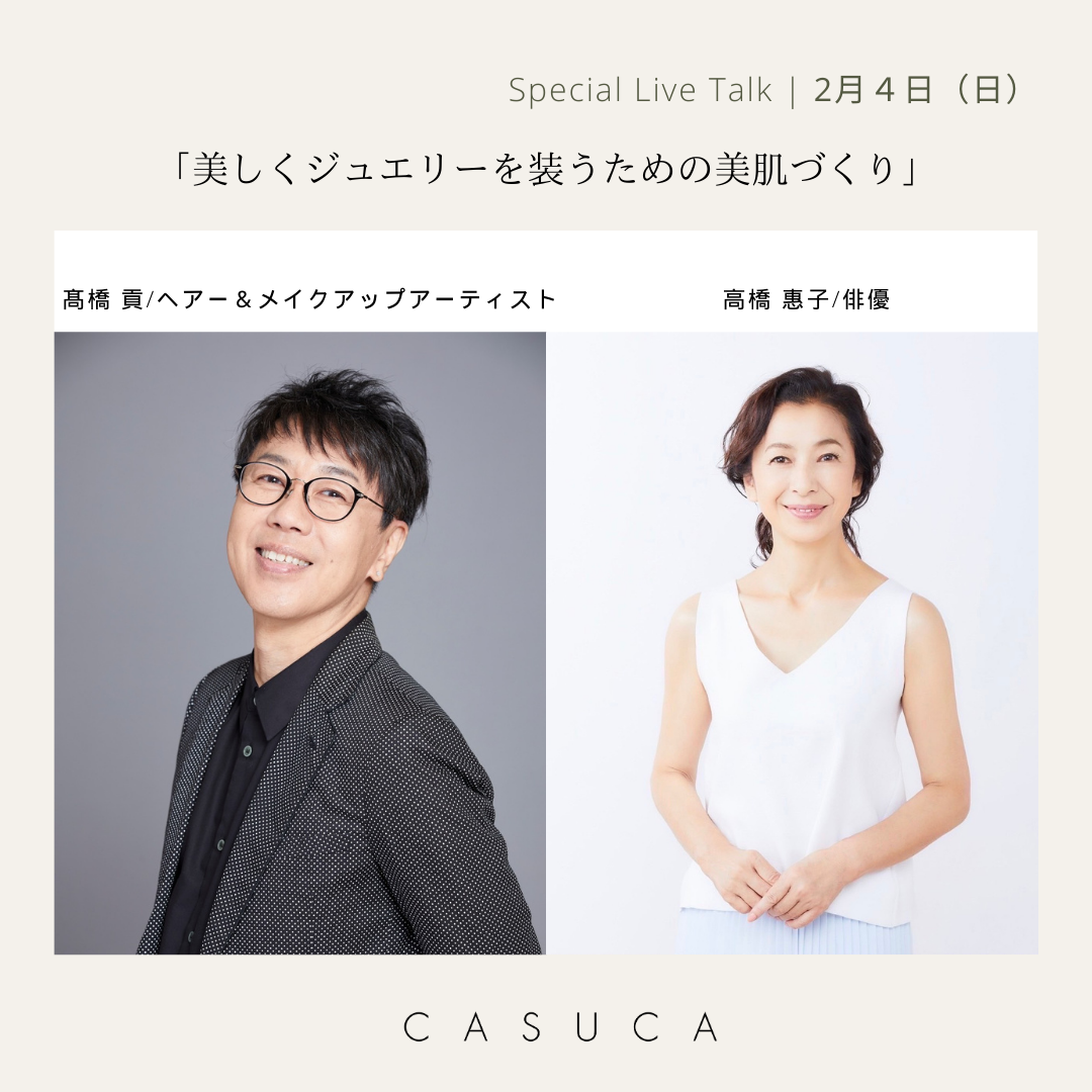 – 美しくジュエリーを装うための美肌づくり – 2024年、C A S U C A が最初にお届けするのは、節分の翌日、2月4日(日)開催のスペシャルトークイベント 俳優・高橋惠子さんと、ヘアー&メイクアップアーティスト・髙橋貢さんをお招きして、「美を見せる側」、そして、「美を作る側」のプロとして、長年にわたってご活躍されてきたお二人それぞれのお立場とご経験か…