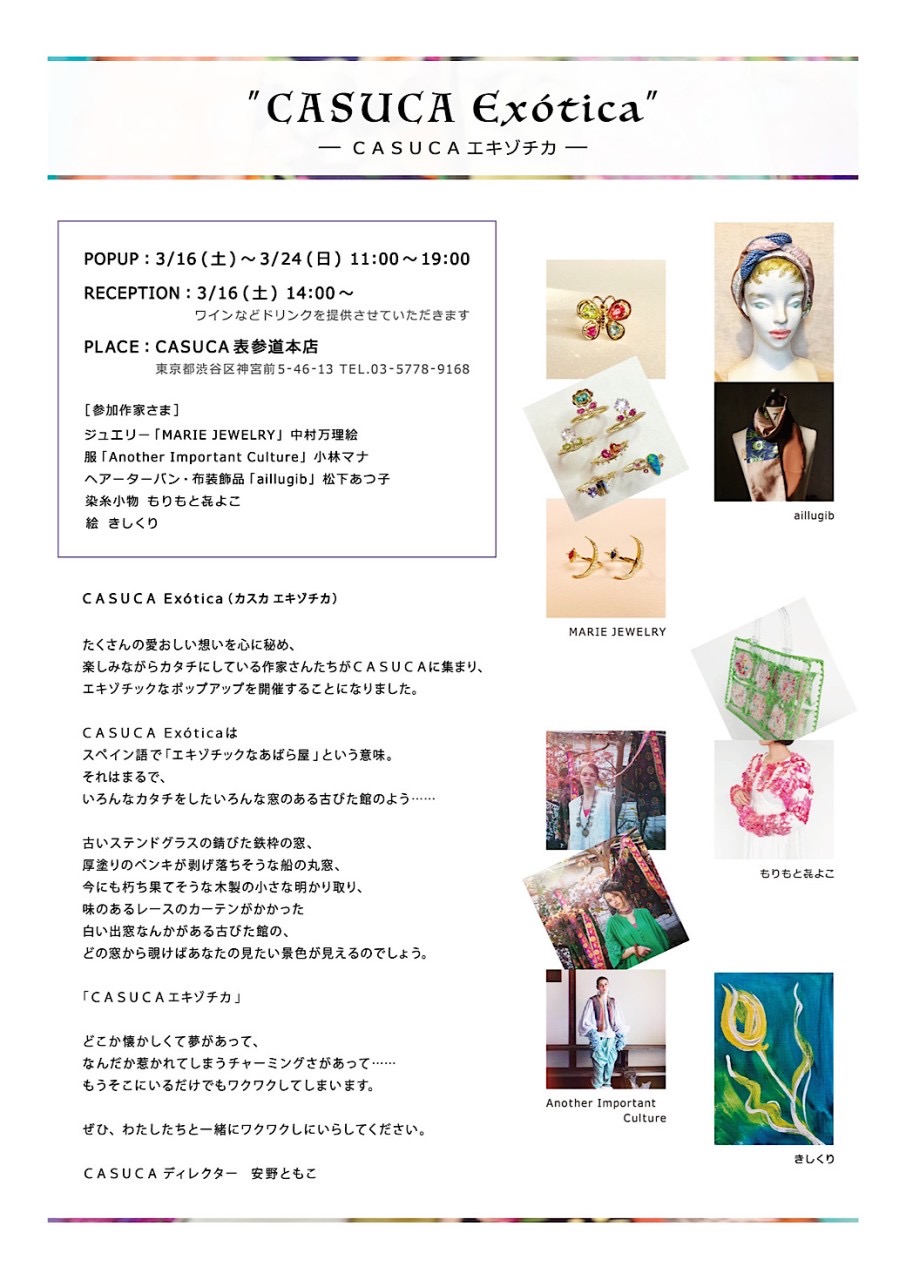 C A S U C A Exótica – カスカエキゾチカ- たくさんの愛おしい想いを心に秘め、 楽しみながらカタチにしている作家さんたちがCASUCAに集まり、 エキゾチックなポップアップを開催することになりました。 C A S U C A Exótica (カスカエキゾチカ)は スペイン語で「エキゾチックなあばら屋」という意味。 それはま…
