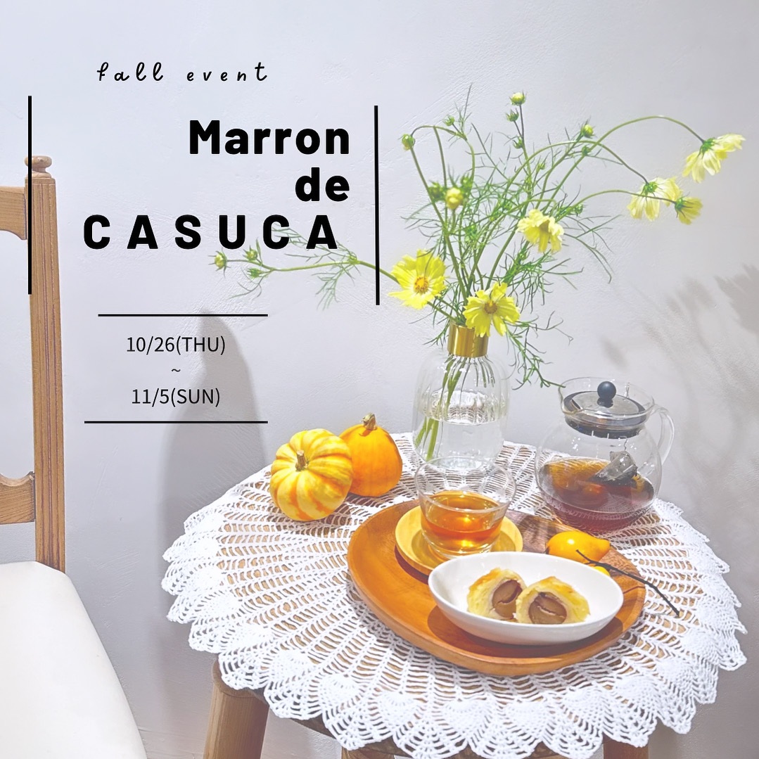 Marron de C A S U C A – マロンドカスカ- 長かった夏も終わり、 いよいよ本格的なおしゃれを ジュエリーと共に楽しむ季節の到来ですね。 C A S U C Aのイメージカラーと言えば ダークブラウン、秋のマロンの色。 そこで、秋の深まりを感じられる下記の期間、 C A S U C A表参道本店ではご来店のお客さまに 栗のお菓子とほうじ茶…